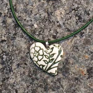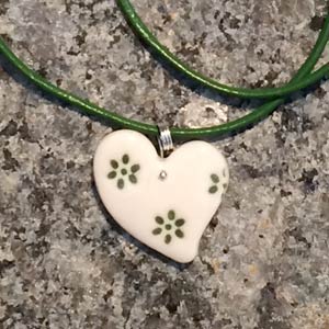 Kleiner Porzellananhänger in Herzform (ca. 2,5cm) in vier verschiedenen Designs ("Nike 1", "Nike 2", Nike 3" und "Rosalie") am farblich passenden Lederband an Sterlingsilberöse mit Sterlingsilber Karabiner-Verschluss (inges. ca. 45cm). Rundum glatt glasiert. In Geschenkbox.
