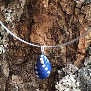 Porzellananhänger in Inglasur-Technik bemalt. Handgemachte grüne und blaue Porzellanperlen mit vom Blaudruck inspirierten weissen Designs. Verschiedene Formen und Designs am 3-strängigen Stahlcollier mit Steckverschluss (ca. 45cm). Rundum glatt glasiert. In Geschenkbox.