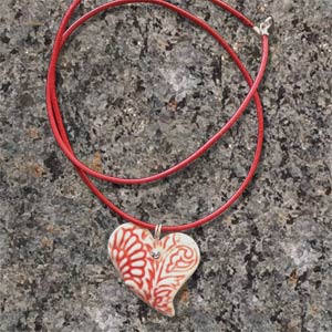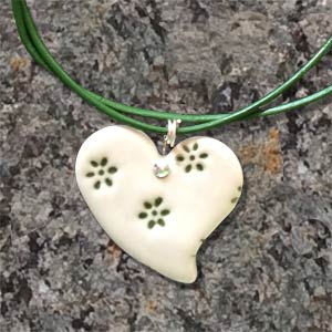 Kleiner Porzellananhänger in Herzform (ca. 3cm) in zwei verschiedenen Designs ("Cosima" und "Rosalie") am farblich passenden Lederband an Sterlingsilberöse mit Sterlingsilber Karabiner-Verschluss (inges. ca. 45cm). Anhänger "Cosima" gibt es optional mit Gold-Highlights. Rundum glatt glasiert. In Geschenkbox.