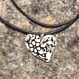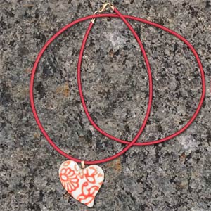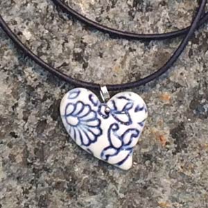 Kleiner Porzellananhänger in Herzform (ca. 2,5cm) in vier verschiedenen Designs ("Nike 1", "Nike 2", Nike 3" und "Rosalie") am farblich passenden Lederband an Sterlingsilberöse mit Sterlingsilber Karabiner-Verschluss (inges. ca. 45cm). Rundum glatt glasiert. In Geschenkbox.