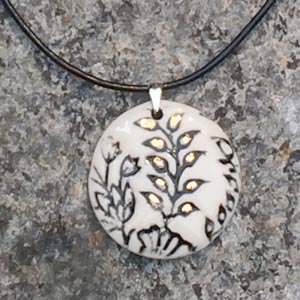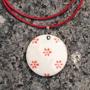 Kleiner runder Porzellananhänger (ca. 3cm) in drei verschiedenen Designs ("Palmetto", "Venus" und "Rosalie") am farblich passenden Lederband an Sterlingsilberöse mit Sterlingsilber Karabiner-Verschluss (inges. ca. 45cm). Anhänger "Palmetto" und "Venus" gibt es optional mit Gold-Highlights. Rundum glatt glasiert. In Geschenkbox.