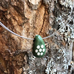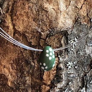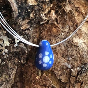 Porzellananhänger in Inglasur-Technik bemalt. Handgemachte grüne und blaue Porzellanperlen mit vom Blaudruck inspirierten weissen Designs. Verschiedene Formen und Designs am 3-strängigen Stahlcollier mit Steckverschluss (ca. 45cm). Rundum glatt glasiert. In Geschenkbox.