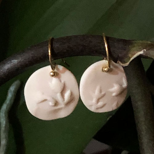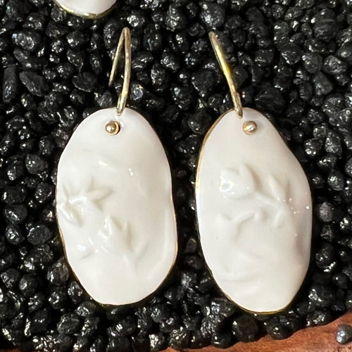Fragile-Stücke sind unregelmässig geformt und zeigen einen feinen Relief-Print. Sie sind unglasiert - gewissermassen pur. Jedes Schmuckstück wird mit vergoldeten Monturen zusammengesetzt.
