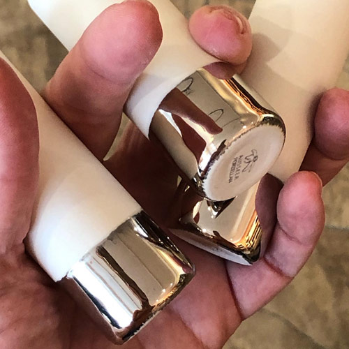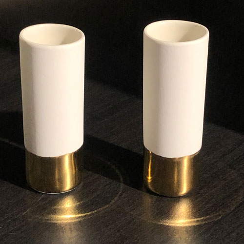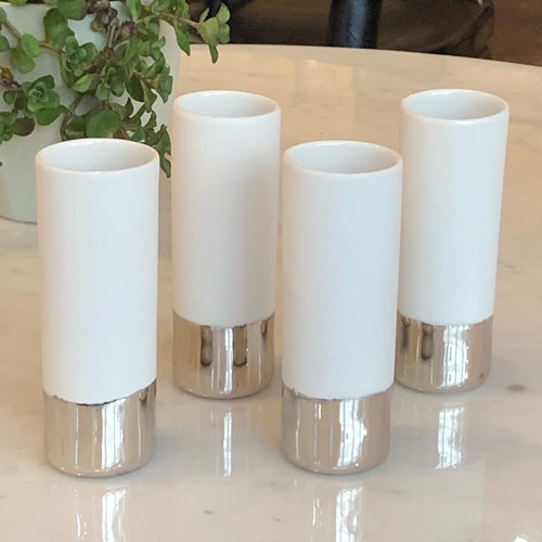 Ebenmäßig weisse, elegante hohe Gläschen mit schwerem Boden und Echtgold- oder Platinbemalung, perfekt für 3cl Füllmenge. Die Einen trinken daraus ein Schnäpschen, die Anderen einen stylischen Espresso, und Manche nutzen sie als kleine Blumenväschen.. Aussen unglasiert und samtig geschliffen, innen glasiert. Spielerische Unregelmässigkeiten in der Gold/Platinmalerei geben hier den Hinweis auf reine Handarbeit. Ca 9x3 cm.