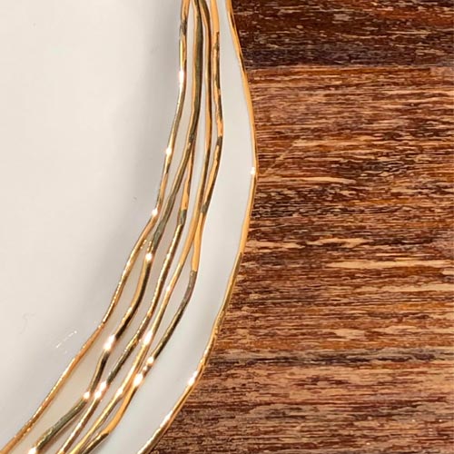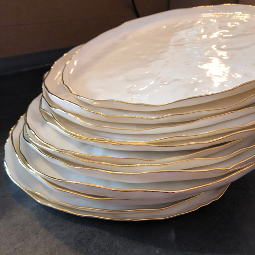 Handgeformte Porzellanteller mit Echtgold- oder Platin-Rand, ca 24cm Durchmesser als Vorlege- oder Speiseteller oder 21cm als Vorspeisen- oder Dessertteller.
