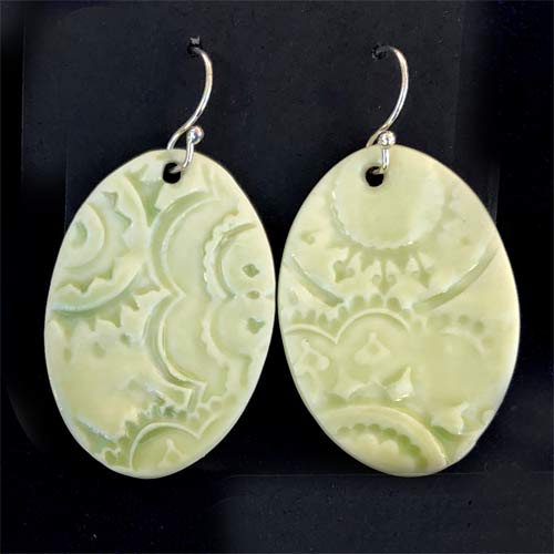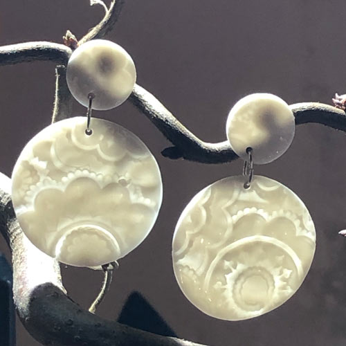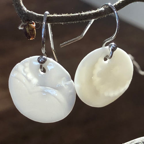 Ohrhänger aus hauchfeinem und doch stabilem Porzellan, beidseitig strukturiert. Bei Auflicht strahlende Statement-Ohrringe, bei Licht von hinten werden die Strukturen sichtbar. Mehrere Varianten: Rund oder oval, einteilig oder 2-teilig, mehrere Farben. Die Grössenangabe ist der Durchmesser, und bezieht sich beim Zweiteiligen nur auf den hängenden Teil! Ovale Hänger gibt es nur in der Länge 4cm. An Sterling-Silber montiert, rundum glatt glasiert. In Geschenkbox.