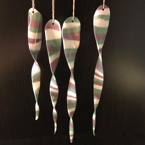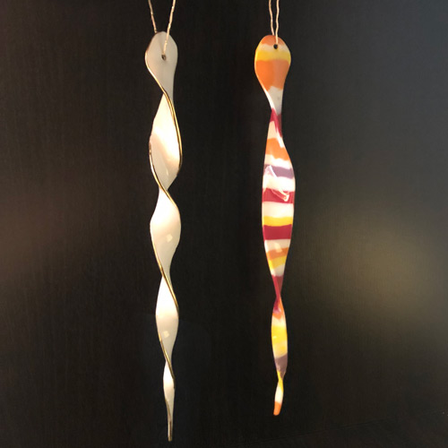 Porzellan-Eiszapfen in drei verschiedenen bunten Farbkombinationen, sehen aus wie aus Glas, sind aber wesentlich leichter. Und sie drehen sich in der warmen Luft um sich selbst. Design: Christine Pötsch & Astrid Wichert. Ca 15-20cm. Am Bändchen, in Geschenkbox.