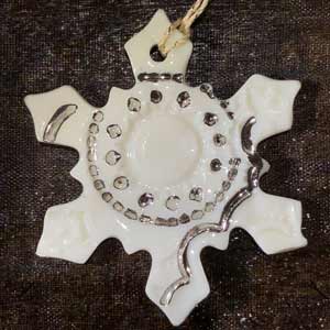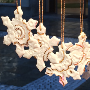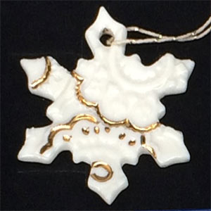 Schneeweiße Porzellan-Schneeflocken mit beidseitigem Relief und Echtgold- oder Platin-Bemalung zum Selbstaufhängen oder Verschenken. Jede Flocke ist natürlich (Schneeflocken!) ein Unikat! Ca. 6cm groß. Am Bändchen & in Geschenkbox.