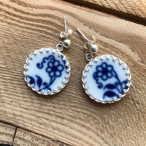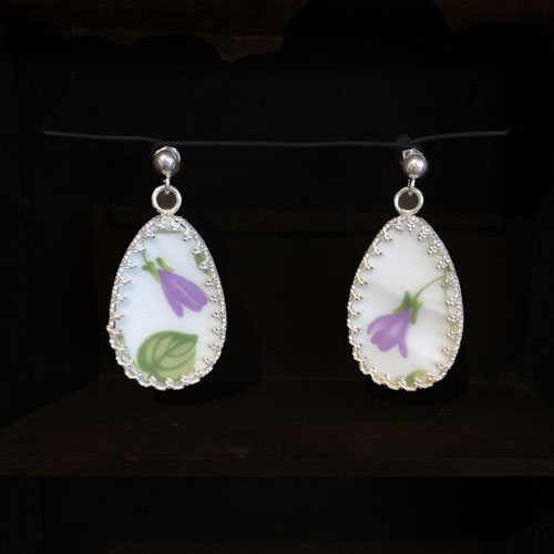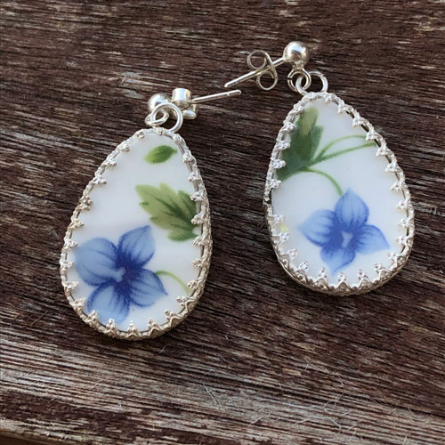 Verkauft. Nr 015: Enzianblüten. Queen's China, ca 3cm. Sterlingsilbergefasst und -Stecker. € 156,-