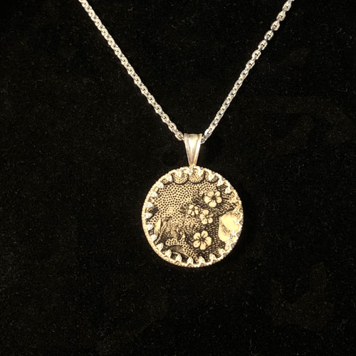 Verkauft. Nr 024: Schwarzer floraler Anhänger, nach einem Kupferstich. Frainer Keramik ca 1880, silbergefasst ca 2,5cm. Ohne Kette. € 96,-