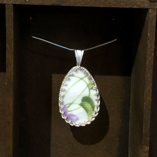 Verkauft. Nr 011: Veilchen und Blatt. Sterlingsilbergefasster Anhänger ca 3cm. Queen's China. Ohne Kette. € 85,-