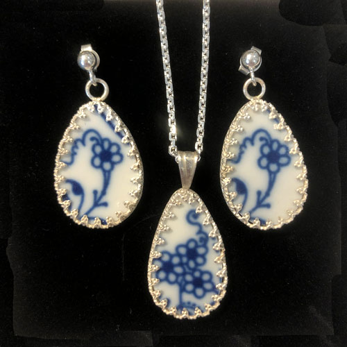 Verkauft. Nr 013: Set: Blaue Blümchen, ovale Ohrhänger und Anhänger ca 3cm. Sterlingsilberfassung
