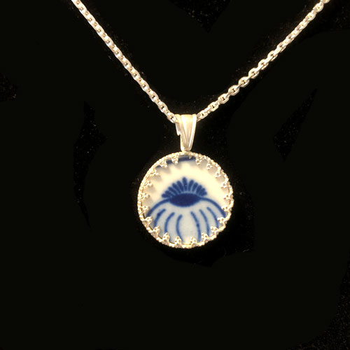 Verkauft. Nr 019: Blaue Blümchen. Runder Anhänger ca 2cm an blauer Samtkette ca 45cm, Sterlingsilberfassung. € 75,-