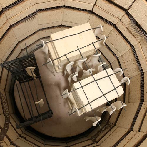 Der erste Brand macht sie soweit stabil, dass ganz gefühlvoll die Oberfläche geschliffen werden kann um eventuell verwischte Oberflächen "sauber" zu machen und die Farben klar rauskommen. Dann werden sie glasiert und schliesslich auf sehr hohen Aufbauten (sie sind ja sehr lang und dürfen währned dem Brand nirgends ankommen!) noch einmal im Ofen gebrannt.