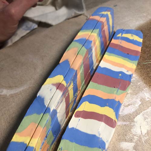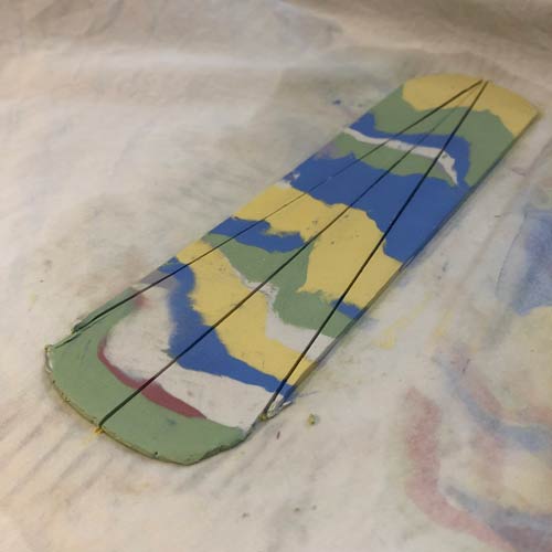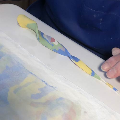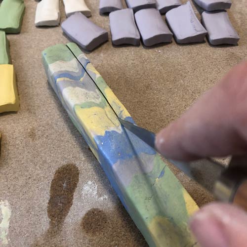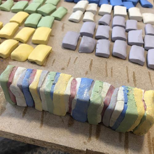 Wir beginnen damit, Porzellan in vielen Farben durchzufärben. Von den gefärbten Blöcken werden verschieden dicke Stücke abgeschnitten, und diese zu einem langen Block gestapelt. Dieser muss nun solange geklopft, massiert, verstrichen, wieder geklopft usw werden, bis alle Einzelblöcke gut miteinander verbunden sind.