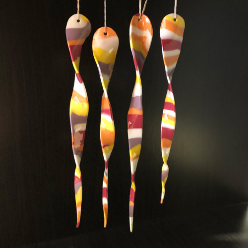 Für Weihnachten 2021 wollte ich etwas richtig Fröhliches entwerfen, mit der Assoziation zu bunten Zuckerstangen im Kopf. Die Entscheidung viel auf Neriage-"Eiszapfen", also aus durchgefärbtem Porzellan.