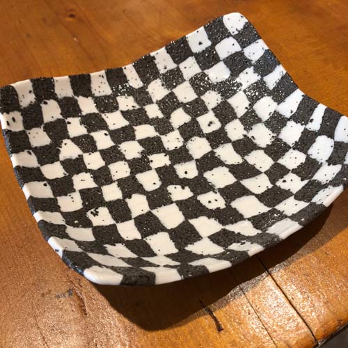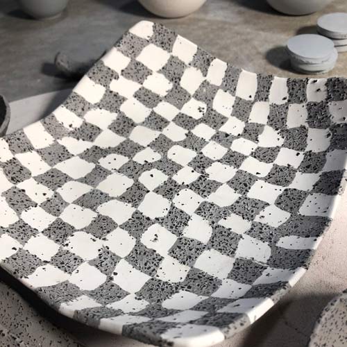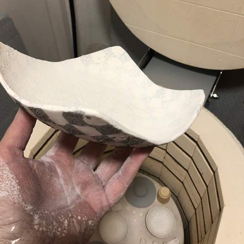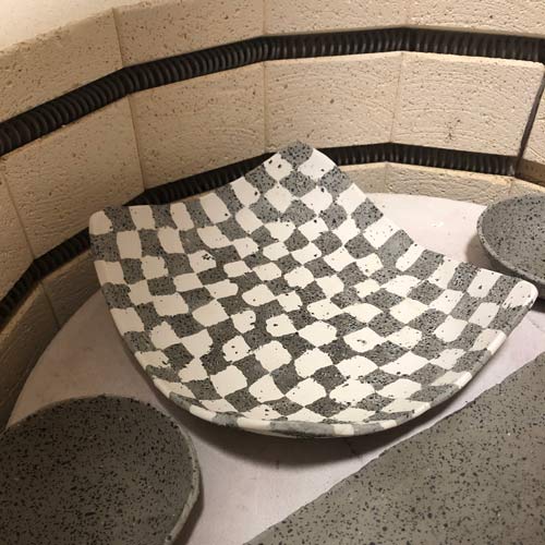 Die fertige Platte wird auf einem Gips-Buckel "überformt", das heisst, solange sanft massiert und geformt bis sie die gerundete Form stabil angenommen hat. Die verwendete Steinzeugmasse muss noch sorgfältig feucht abgewischt werden um die groben Schamotte freizulegen. Sobald die Schale "lederhart", also nicht mehr weich sondern schon einigermassen getrocknet ist, wird auch die Innenseite sorgfältig gewischt, immerhin sollen die weissen Felder sauber weiss bleiben.