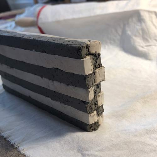 Neugier und Freude am kühnen Experiment haben dazu geführt, diese "unheilige" Kombination aus Steinzeug und Porzellan zu versuchen. Denn das schwarz-braune Steinzeug mit der interessanten höchst groben Struktur schrumpft beim Brennnen nur 4% - im Gegensatz zum feinen weissen Porzellan, das 14% schrumpft..